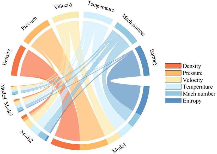 POD: X ≈ UΣV beta is achieved through Singular Value Decomposition (SVD). Among them, U contains the modal coefficient information, V contains the Spatial Modes, and the diagonal elements of Σ are singular values, representing the energy contribution of each mode. After being arranged in descending order of energy, the first mode accounts for 85.72% of the pressure field energy and 88.00% of the entropy field. The cumulative energy of the first 12 modes reaches 99%, so the truncation order k=12 is selected, and the higher-order modes are discarded to filter out numerical noise.